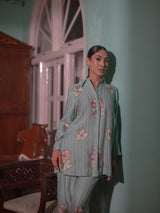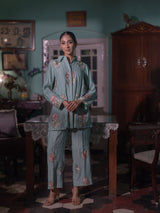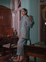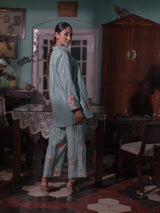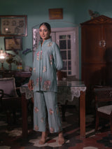 Step into a world of refined elegance with this exquisite co-ord set, thoughtfully crafted from luxurious Mal Chanderi fabric and delicately adorned with intricate Persian embroidery.