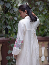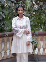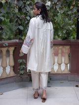 A graceful celebration of minimalism and tradition, this ivory co-ord set is crafted from lightweight Chanderi fabric, featuring soft floral embroidery in delicate shades of pastels.