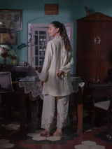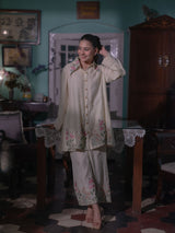 Step into a world of refined elegance with this exquisite co-ord set, thoughtfully crafted from luxurious Mal Chanderi fabric and delicately adorned with intricate embroidery.