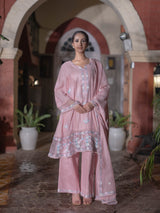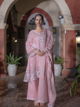 This ensemble brings together the ethereal lightness of mul, the gossamer softness of organza, and the timeless heritage of Kota. Thoughtfully layered with colorful aari work, each piece evokes a sense of quiet luxury.