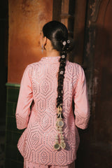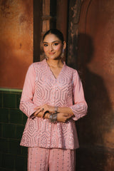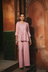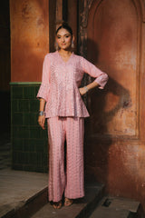 A resplendent mirror-work co-ord set crafted from luxurious Crepe satin, radiating festive opulence. The shirt showcases intricate hand-embellished mirror detailing in geometric patterns that catch and reflect light with every movement, creating a luminous play of reflections. Featuring a V-neckline and flared sleeves, the silhouette strikes a perfect balance between modern sophistication and traditional artistry. The coordinated trousers mirror the same meticulous craftsmanship, completing a look that’s effortlessly elegant — ideal for festive gatherings, evening soirées, or celebratory occasions. Silk satin Hand-embroidered mirror work · Geometric pattern · Flared sleeves · Coordinated trousers.