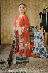 Dupatta-Transparent base with a rich floral print in burgundy, cream, and green tones. Intricate borders with vintage-style motifs, resembling embroidery but printed. Gives a light, graceful, and sheer finish that balances the heavier shirt fabric.