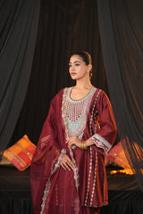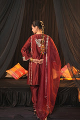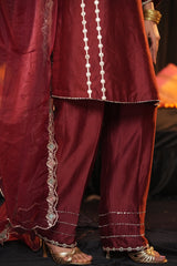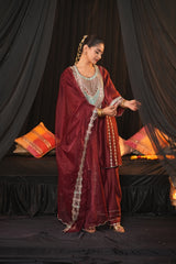 Shirt: Crafted from luxurious Chanderi Silk, this elegant shirt features intricate zari and thread work adorning the neckline, sleeves, and ghera. The delicate embroidery enhances the fabric’s natural sheen, offering a regal and sophisticated appeal perfect for special occasions.