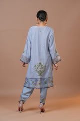 Experience luxury with our Mal Chanderi suit and dupatta, paired with a cotton silk salwar. The ensemble is adorned with elaborate threadwork, delicate hand-painted flowers, and exquisite zari work. Pure organza silk patches enhance the hemline of the sleeves, shirt, and salwar, adding a refined touch. Ideal for special occasions, this outfit seamlessly combines lavish fabrics with meticulous detailing.