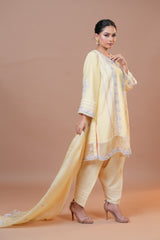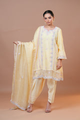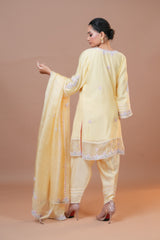 Experience elegance with our exquisite suit ensemble featuring a Mal Chanderi shirt, cotton silk trousers, and a pure Kota silk dupatta. The shirt, crafted from fine Mal Chanderi, is adorned with delicate silk organza patches. The cotton silk trousers are enhanced with intricate multi-color Dori work and organza patches on the hemline, adding a touch of vibrant sophistication. Completing the look, the pure Kota silk dupatta offers a sheer, graceful finish. This ensemble is perfect for any special occasion, blending luxurious fabrics with refined detailing for a truly standout appearance.