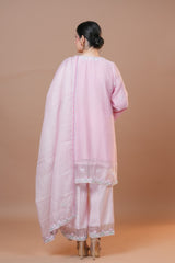 Experience elegance with our exquisite suit ensemble featuring a Mal Chanderi shirt, cotton silk trousers, and a pure Kota silk dupatta. The shirt, crafted from fine Mal Chanderi, is adorned with delicate silk organza patches. The cotton silk trousers are enhanced with intricate multi-color Dori work and organza patches on the hemline, adding a touch of vibrant sophistication. Completing the look, the pure Kota silk dupatta offers a sheer, graceful finish. This ensemble is perfect for any special occasion, blending luxurious fabrics with refined detailing for a truly standout appearance.