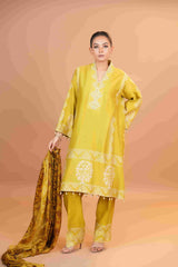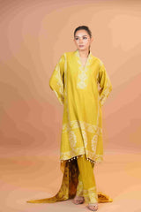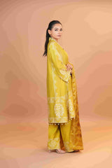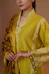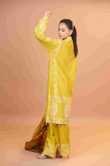 Shirt :- Crafted from exquisite tussar chanderi silk, this shirt is a harmonious blend of tradition and modernity. The digital prints are adorned with detailed thread and badla work on the neckline, evoking the intricate beauty of India’s artistic heritage. Each print blooms like a handwoven tapestry, creating a luxurious piece that pays homage to the rustic charm of Punjab’s Phulkari while capturing the regal grandeur of Jaipur’s Jaimahal.