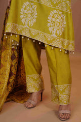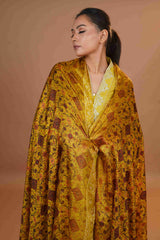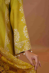 Trousers :- Designed with both comfort and style in mind, these tussar chanderi silk trousers feature a delicate digital print border at the bottom, adding a subtle yet sophisticated touch. The fine craftsmanship and luxurious fabric elevate the trousers from simple to statement, offering a versatile piece that blends the age-old artistry of India with contemporary flair. A perfect pairing for the Mahalkari ensemble, they complete the look with an understated elegance.