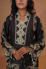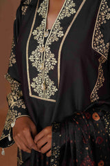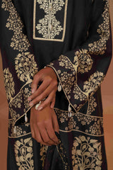 Shirt :- Crafted from exquisite tussar chanderi silk, this shirt is a harmonious blend of tradition and modernity. The digital prints are adorned with detailed thread and badla work on the neckline, evoking the intricate beauty of India’s artistic heritage. Each print blooms like a handwoven tapestry, creating a luxurious piece that pays homage to the rustic charm of Punjab’s Phulkari while capturing the regal grandeur of Jaipur’s Jaimahal.
