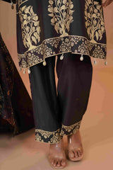 Trousers :- Designed with both comfort and style in mind, these tussar chanderi silk trousers feature a delicate digital print border at the bottom, adding a subtle yet sophisticated touch. The fine craftsmanship and luxurious fabric elevate the trousers from simple to statement, offering a versatile piece that blends the age-old artistry of India with contemporary flair. A perfect pairing for the Mahalkari ensemble, they complete the look with an understated elegance.