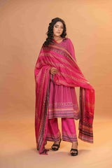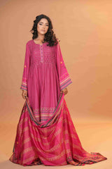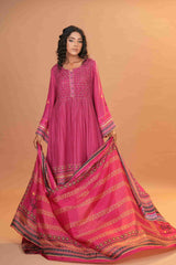 The accompanying tabby silk dupatta is a masterpiece in its own right. Featuring captivating digital prints that depict Indian heritage and the grand artistry of Jaipur’s Jaimahal, it drapes effortlessly with grace. The rich colors and detailed patterns evoke a regal opulence, making this dupatta the ideal complement to the Anarkali, creating a seamless blend of tradition and modern sophistication.