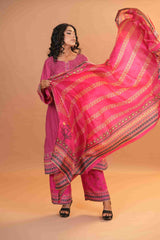 The Maheshwari silk trousers bring the ensemble together with a subtle yet striking touch. Embellished with a digital print border and intricate gotta work at the bottom, these trousers are a testament to fine craftsmanship. The luxurious fabric and artistic detailing make them both comfortable and visually stunning, adding a contemporary edge to the traditional elegance of the Mahalkari Rajwara collection.