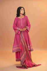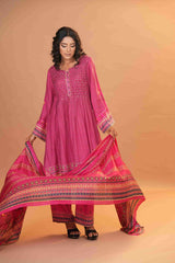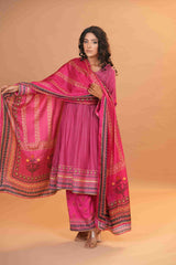 This Maheshwari silk Anarkali is a vision of elegance, woven with intricate digital prints and adorned with smkey effect and sequin work on the neckline. The design blooms like a handwoven tapestry, each print telling a story of India’s rich cultural legacy. The flowing silhouette combines traditional artistry with contemporary elegance, making it a perfect piece for those who appreciate the beauty of heritage reimagined for today.