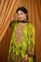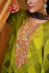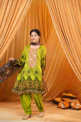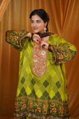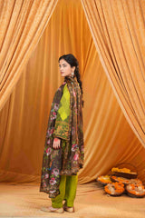 The dupatta, made from delicate tabby silk, beautifully complements the shirt with its rich digital prints. Its flowing texture and detailed artistry provide a stunning contrast to the silk satin, adding depth to the overall look. The combination of fabrics creates a harmonious balance, highlighting the heritage-inspired motifs while maintaining a modern, luxurious feel.