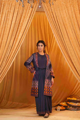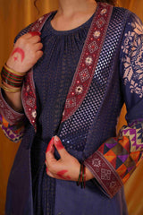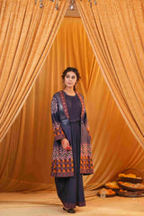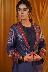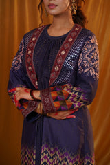 This elegant dupian silk jacket is a blend of heritage and contemporary design. The collar and neckline are adorned with exquisite mirror and kantha work, further enhanced by dori detailing and sleek PVC stripes, reminiscent of a traditional mat design. The rich digital prints add depth and vibrancy, making this shirt a true masterpiece of textures.
