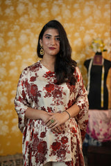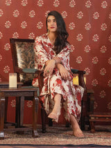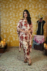 Drape yourself in the allure of luxury with this exquisite silk satin kaftaan set, adorned with delicate floral prints that exude timeless elegance. The flowy silhouette glides effortlessly, offering both comfort and sophistication. Crafted from premium silk satin, the fabric boasts a lustrous sheen and a soft, graceful fall. Paired with matching trousers in the same floral print, this ensemble is a statement of refined femininity — perfect for brunches, festive gatherings, or intimate soirées.