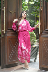 Drape yourself in the allure of luxury with this exquisite silk satin wrap around set, adorned with delicate floral prints that exude timeless elegance. The flowy silhouette glides effortlessly, offering both comfort and sophistication. Crafted from premium silk satin, the fabric boasts a lustrous sheen and a soft, graceful fall. Paired with matching trousers in the same floral print, this ensemble is a statement of refined femininity — perfect for brunches, festive gatherings, or intimate soirées.