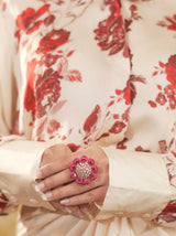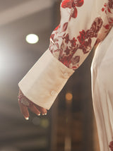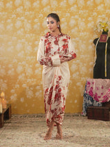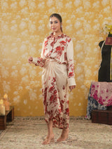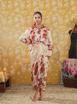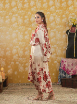 Drape yourself in the allure of luxury with this exquisite silk satin wrap around set, adorned with delicate floral prints that exude timeless elegance. The flowy silhouette glides effortlessly, offering both comfort and sophistication. Crafted from premium silk satin, the fabric boasts a lustrous sheen and a soft, graceful fall. Paired with matching trousers in the same floral print, this ensemble is a statement of refined femininity — perfect for brunches, festive gatherings, or intimate soirées.