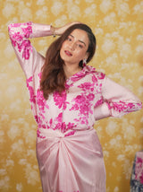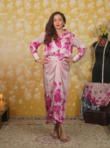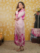 Drape yourself in the allure of luxury with this exquisite silk satin wrap around set, adorned with delicate floral prints that exude timeless elegance. The flowy silhouette glides effortlessly, offering both comfort and sophistication. Crafted from premium silk satin, the fabric boasts a lustrous sheen and a soft, graceful fall. Paired with matching trousers in the same floral print, this ensemble is a statement of refined femininity — perfect for brunches, festive gatherings, or intimate soirées.