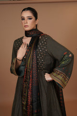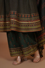 The accompanying tabby silk dupatta is a masterpiece in its own right. Featuring captivating digital prints that depict Indian heritage and the grand artistry of Jaipur’s Jaimahal, it drapes effortlessly with grace. The rich colors and detailed patterns evoke a regal opulence, making this dupatta the ideal complement to the Anarkali, creating a seamless blend of tradition and modern sophistication.