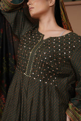 This Maheshwari silk Anarkali is a vision of elegance, woven with intricate digital prints and adorned with smokey effect and sequin work on the neckline. The design blooms like a handwoven tapestry, each print telling a story of India’s rich cultural legacy. The flowing silhouette combines traditional artistry with contemporary elegance, making it a perfect piece for those who appreciate the beauty of heritage reimagined for today.
