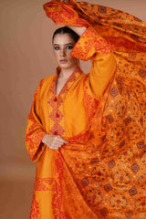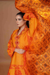 Shirt :- Crafted from exquisite tussar chanderi silk, this shirt is a harmonious blend of tradition and modernity. The digital prints are adorned with detailed thread and badla work on the neckline, evoking the intricate beauty of India’s artistic heritage. Each print blooms like a handwoven tapestry, creating a luxurious piece that pays homage to the rustic charm of Punjab’s Phulkari while capturing the regal grandeur of Jaipur’s Jaimahal.