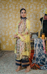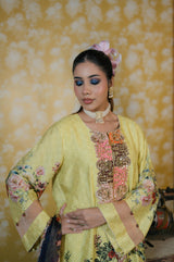 Bottom: The trousers carry a soft floral digital print that complements the shirt’s florals. Sheer organza panels added at the hem, giving a modern, stylish contrast to the traditional look.