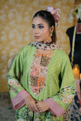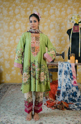 Dupatta-Transparent base with a rich floral print in burgundy, cream, and green tones. Intricate borders with vintage-style motifs, resembling embroidery but printed. Gives a light, graceful, and sheer finish that balances the heavier shirt fabric.