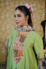 This beautifully curated ensemble showcases a timeless blend of traditional charm and contemporary style, designed for elegance and comfort. Features delicate handwork embroidery that adds texture and subtle sophistication to the overall look. This outfit is a beautiful traditional ensemble featuring a rich blend of textures, colors, and intricate detailing.