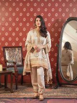 This exquisite ensemble is tailored from luxurious satin silk fabric, offering a fluid drape and a subtle sheen. The shirt is adorned with elegant digital prints inspired by traditional motifs, complemented by intricate handwork detailing along the neckline, adding a touch of artisanal finesse. It is paired with matching trousers, delicately enhanced with a printed border along the hemline for a refined finish. The look is completed with a beautifully printed dupatta, featuring coordinated patterns that bring harmony to the entire outfit. Perfect for festive gatherings and elegant daytime occasions, this ensemble exudes effortless grace and timeless sophistication.