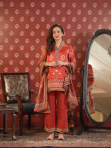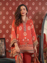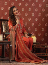 This exquisite ensemble is tailored from luxurious satin silk fabric, offering a fluid drape and a subtle sheen. The shirt is adorned with elegant digital prints inspired by traditional motifs, complemented by intricate handwork detailing along the neckline, adding a touch of artisanal finesse. It is paired with matching trousers, delicately enhanced with a printed border along the hemline for a refined finish. The look is completed with a beautifully printed dupatta, featuring coordinated patterns that bring harmony to the entire outfit. Perfect for festive gatherings and elegant daytime occasions, this ensemble exudes effortless grace and timeless sophistication.