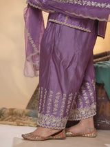 An exquisite tussar chanderi suit that embodies timeless elegance and traditional charm. The kurta is beautifully adorned with delicate zari work along the neckline and sleeves, adding a graceful shimmer to the ensemble. It is paired with a farshi-style salwar, exuding regal allure with its voluminous silhouette and zari-detailed hemline.