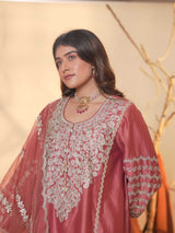 The look is completed with an organza dupatta, featuring four-sided Zari borders that lend a touch of ethereal sophistication. Perfect for festive gatherings, cultural celebrations, or elegant soirées — this ensemble captures the essence of refined craftsmanship and understated opulence.