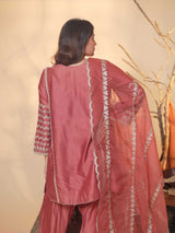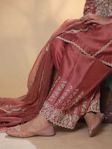 An exquisite tussar chanderi suit that embodies timeless elegance and traditional charm. The kurta is beautifully adorned with delicate zari work along the neckline and sleeves, adding a graceful shimmer to the ensemble. It is paired with a farshi-style salwar, exuding regal allure with its voluminous silhouette and zari-detailed hemline.