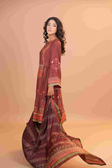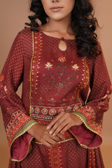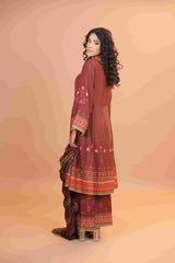 The accompanying tabby silk dupatta is a masterpiece in its own right. Featuring captivating digital prints that depict Indian heritage and the grand artistry of Jaipur’s Jaimahal, it drapes effortlessly with grace. The rich colors and detailed patterns evoke a regal opulence, making this dupatta the ideal complement to the Anarkali, creating a seamless blend of tradition and modern sophistication.