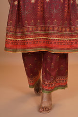 The Maheshwari silk trousers bring the ensemble together with a subtle yet striking touch. Embellished with a digital print border and intricate gotta work at the bottom, these trousers are a testament to fine craftsmanship. The luxurious fabric and artistic detailing make them both comfortable and visually stunning, adding a contemporary edge to the traditional elegance of the Mahalkari Rajwara collection.