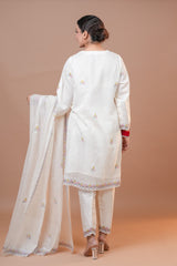 Salwar: Cotton silk material featuring tonal embroidery and silk organza accents.