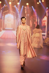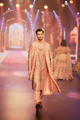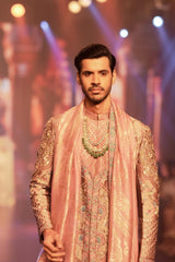 Experience the allure of timeless craftsmanship with this Onion Pink Sherwani, a masterpiece of artisan work and intricate hand embroidery. Every inch of this sherwani is adorned with the delicate handwork of zardozi, showcasing the unparalleled skill of master artisans. The fine detailing and luxurious texture of the fabric bring out the beauty of the traditional zardozi techniques, making this sherwani a true work of art. Paired with a perfectly coordinated salwar and kurta, this ensemble reflects the richness of cultural heritage while offering a contemporary silhouette. The ensemble is further enhanced by a matching stole, draped elegantly to complete the look. Ideal for those who seek to blend tradition with modern elegance, this outfit ensures you make a memorable statement at any grand celebration.