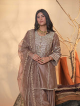 An exquisite tussar chanderi suit that embodies timeless elegance and traditional charm. The kurta is beautifully adorned with delicate zari work along the neckline and sleeves, adding a graceful shimmer to the ensemble. It is paired with a farshi-style salwar, exuding regal allure with its voluminous silhouette and zari-detailed hemline.